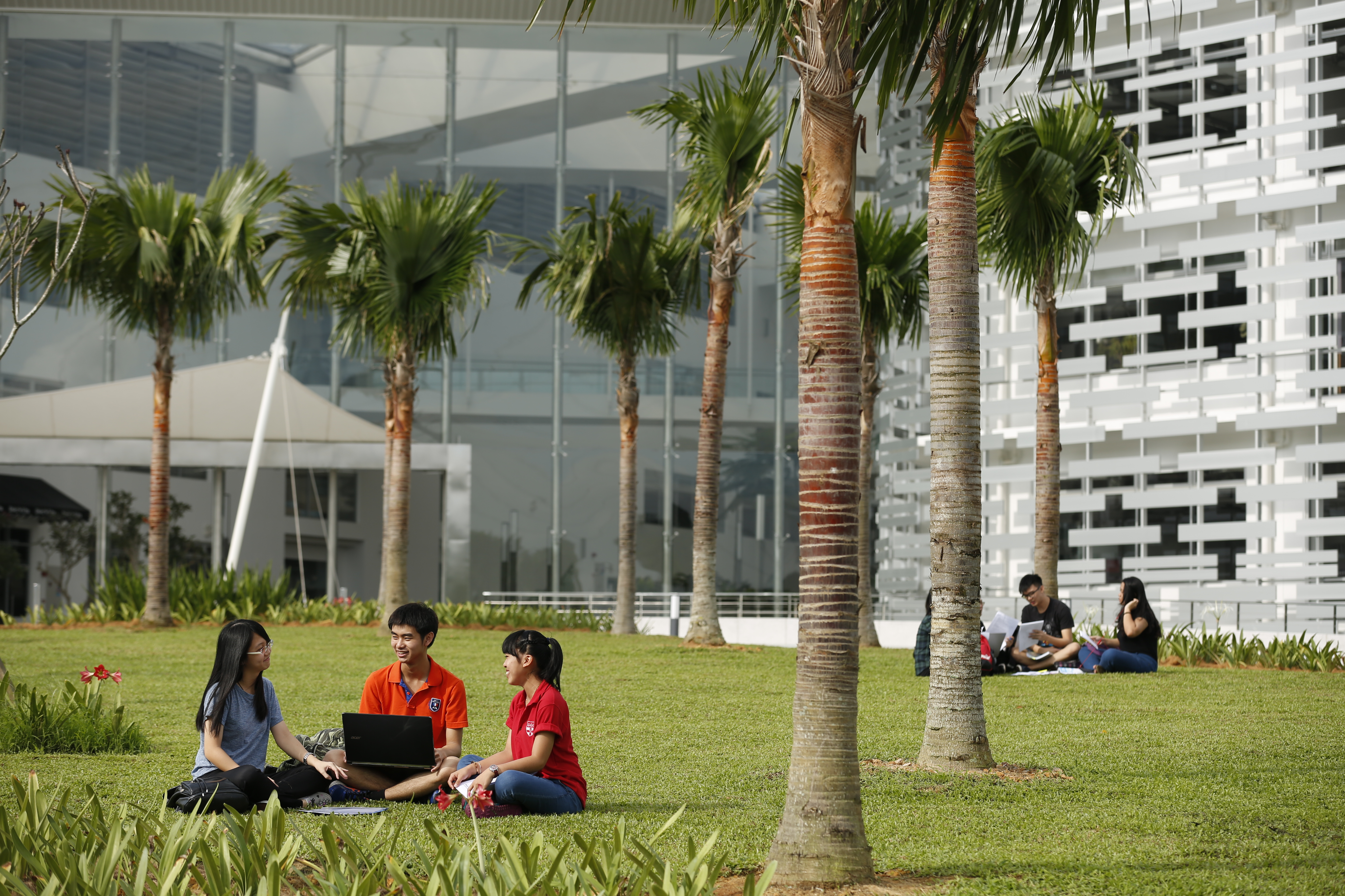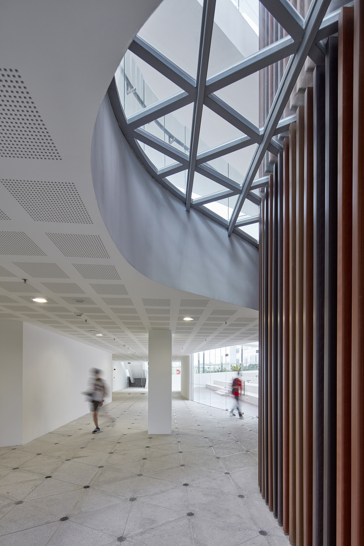 Diagonal ramps cross and define the forum and suspended bridges above echo these ramps and connect the parallel teaching wings. Our environmentally responsive design was realised through an exemplary brief and design process led from the UK with construction stage monitoring services provided from our Singapore studio.