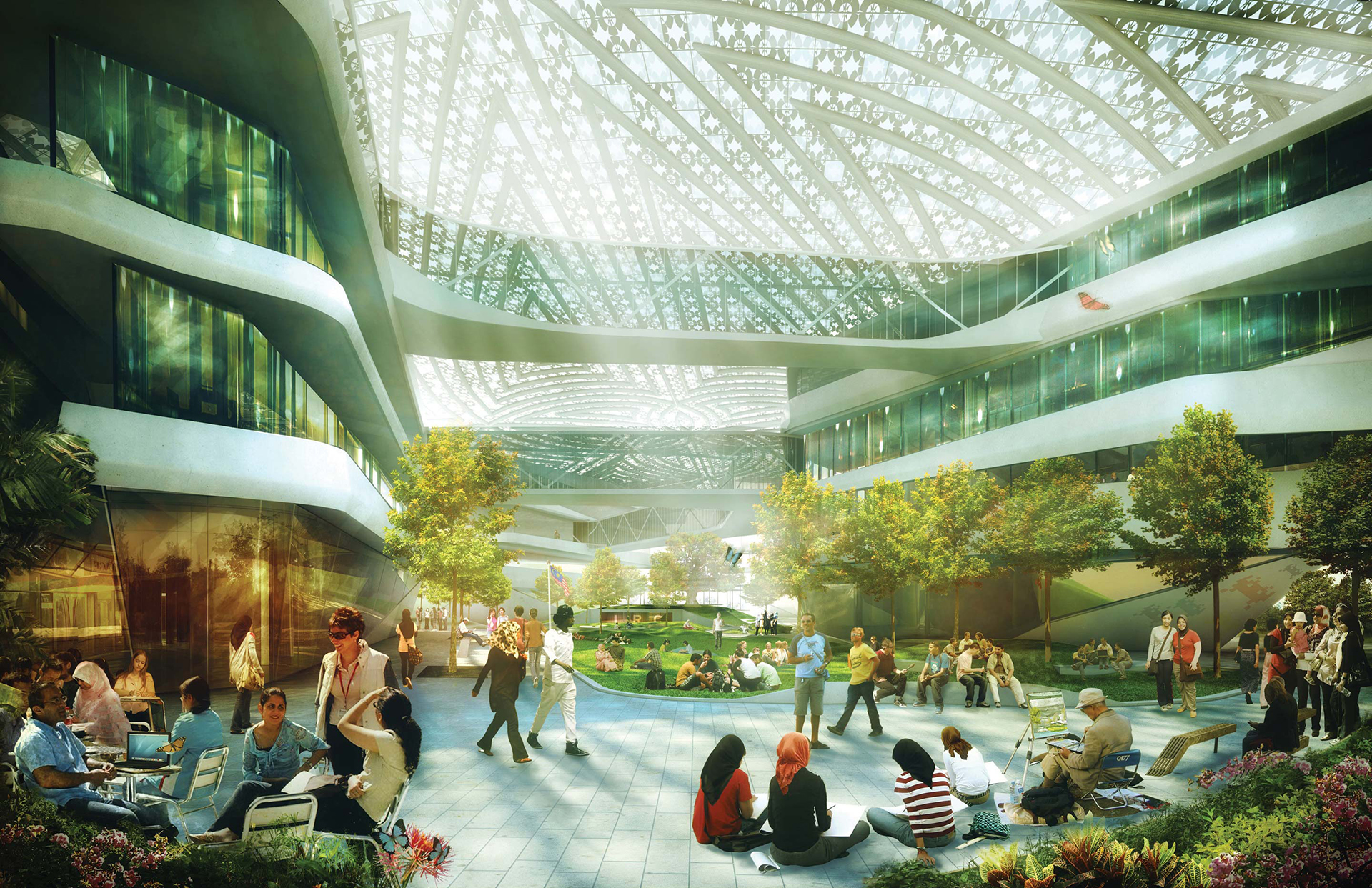 Based upon a simple forum approach, our design places accommodation around a covered heart-space which blurs the traditional boundaries between the buildings and landscape, student and staff areas, formal and informal, learning and social spaces. A translucent roof protects the heart space from direct sunlight and rain, forming a lush green environment for people to work, learn, live and socialise.