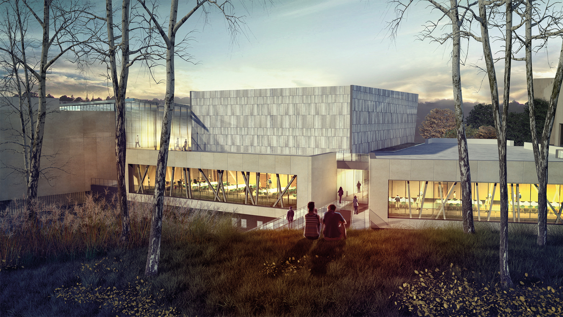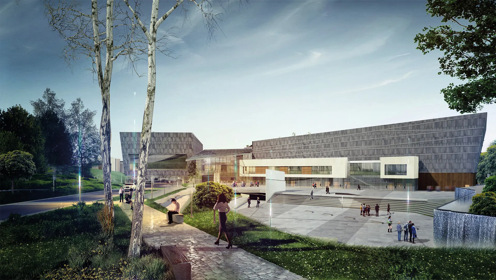 The two principal volumes (auditorium and main hall) were conceived as slate prisms - inspired by the industrial heritage of Newport and the traditional Welsh burial chamber. The facility was to be the third slate jewel on the M4 necklace following on from the Maritime museum in Swansea and the Concert Hall in Cardiff.